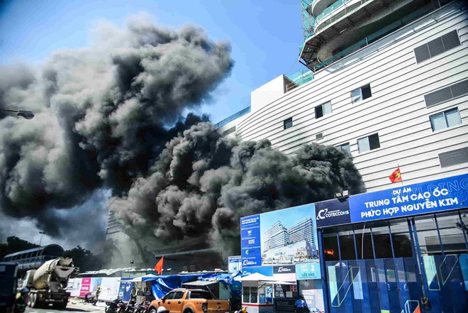 Tại công trường xây dựng Trung tâm cao ốc phức hợp Nguyễn Kim bất ngờ xảy ra cháy lớn, khói lửa bốc cao dữ dội.